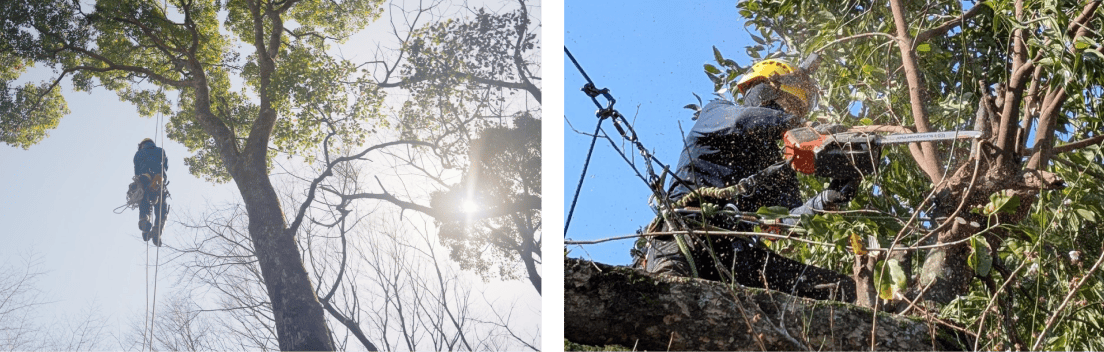 特殊伐採やロープを活用した伐採技術(ツリークライミング)を得意とする専門業者です。空師の技術を駆使し、安全かつ確実な作業をお約束します!